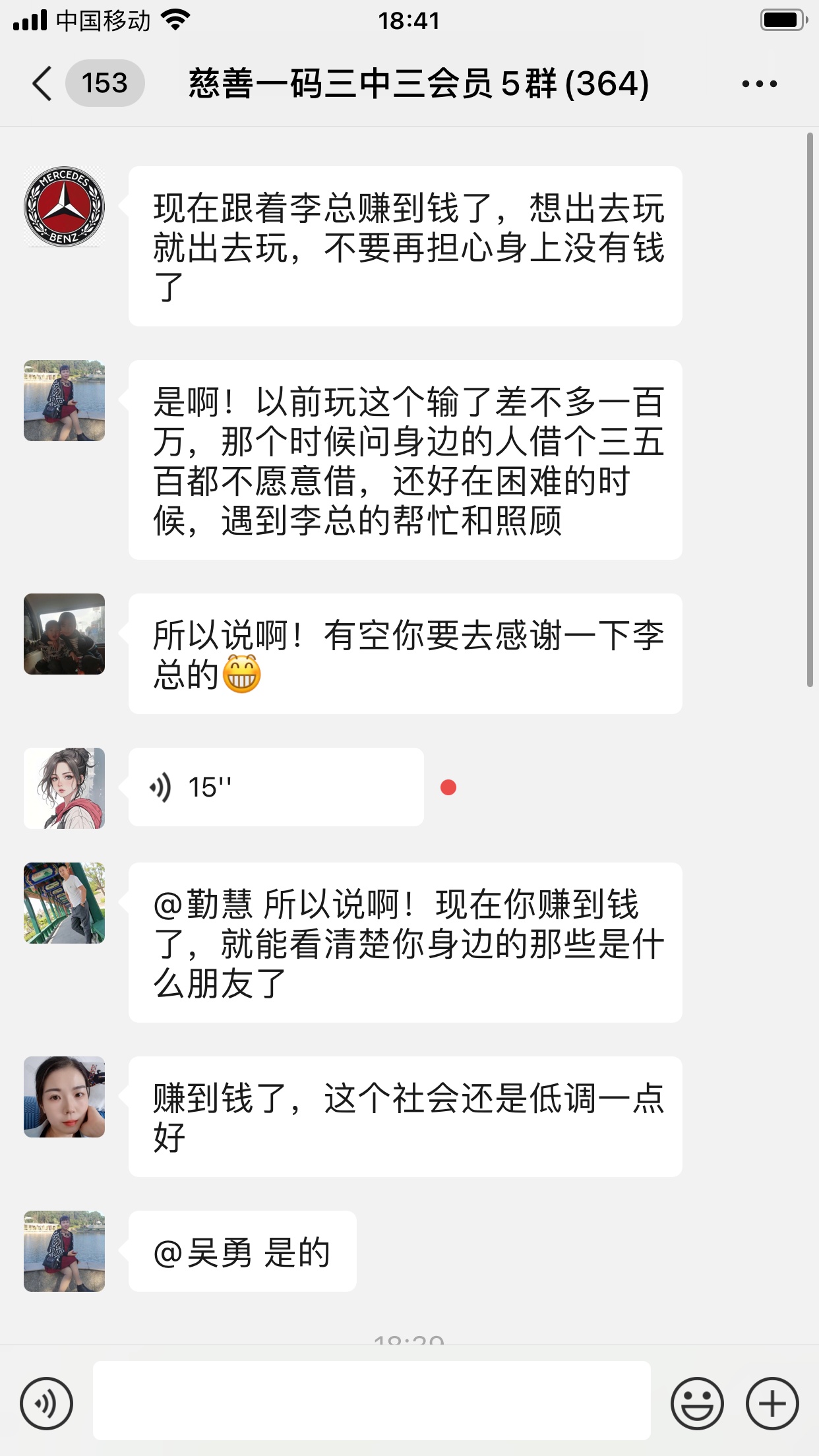 李总我今天刚入会的,说起来还得感谢过年回家好兄弟把你介绍给我,他说你的资料很厉害,我期待今晚大放异彩,中奖了我给你大红包,到时候你就是我的贵人了。 |